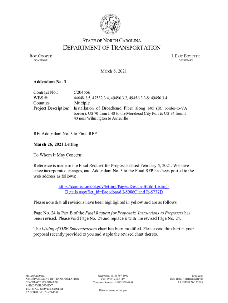STATE OF NORTH CAROLINADEPARTMENT OF TRANSPORTATION ROY COOPER. ERIC BOYETTEGOVERNORSECRETARYMarch 5, 2021 Addendum No. 3 Contract No.: C204556 WBS #: 44648.3.5, 47532.3.4, 49456.3.2, 49456.3.3 &