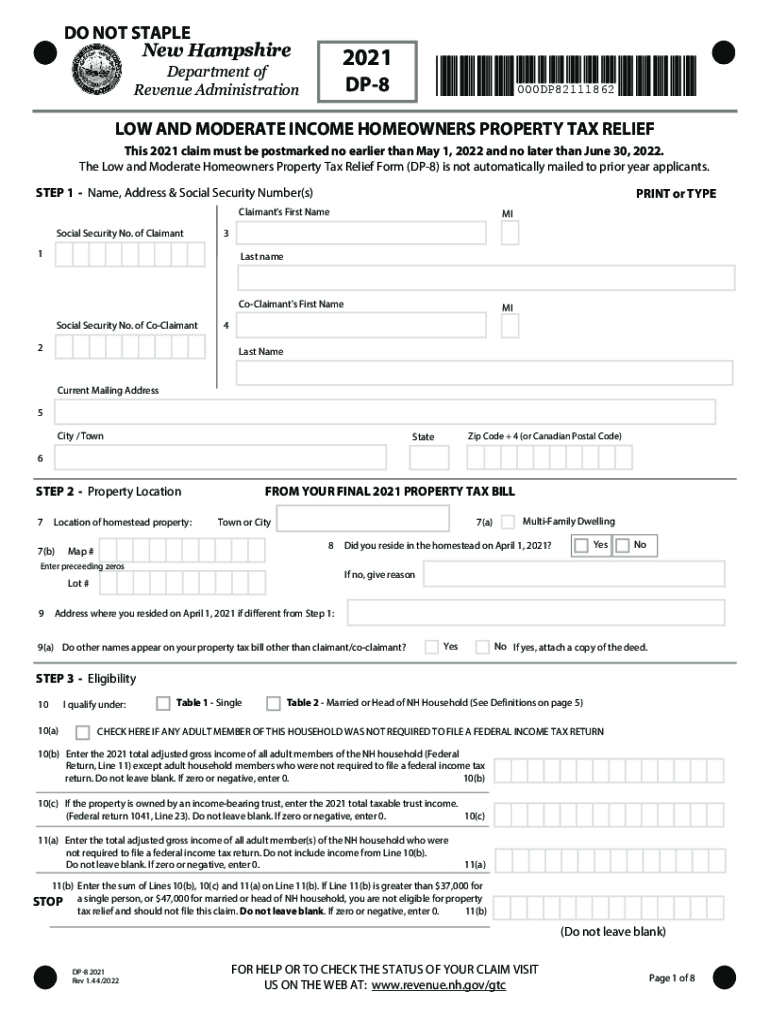 DO NOT STAPLE New Hampshire2021Department of Revenue AdministrationDP8000DP82111862LOW AND MODERATE INCOME HOMEOWNERS PROPERTY TAX RELIEF This 2021 claim must be postmarked no earlier than May 1,