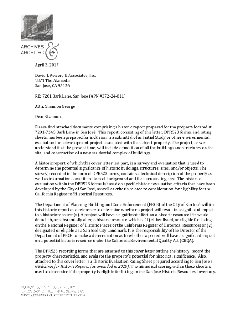 April 3, 2017, David J. Powers & Associates, Inc. 1871 The Alameda San Jose, CA 95126 RE: 7201 Bark Lane, San Jose (APN #37224011) Attn: Shannon George Dear Shannon, Please find attached documents