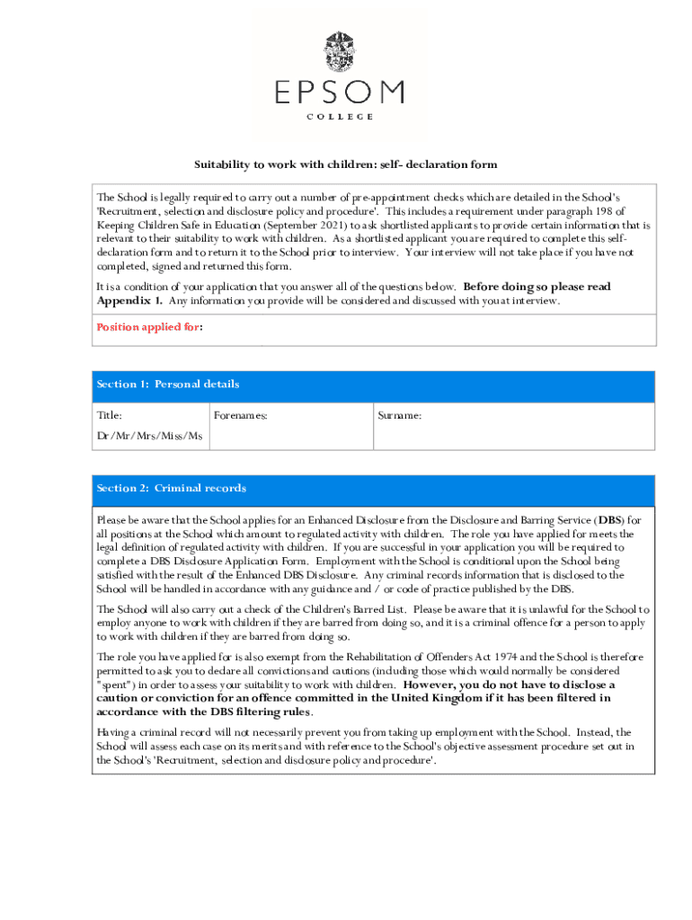 Suitability to work with children: self declaration form The School is legally required to carry out a number of reappointment checks which are detailed in the School\'s \'Recruitment, selection and