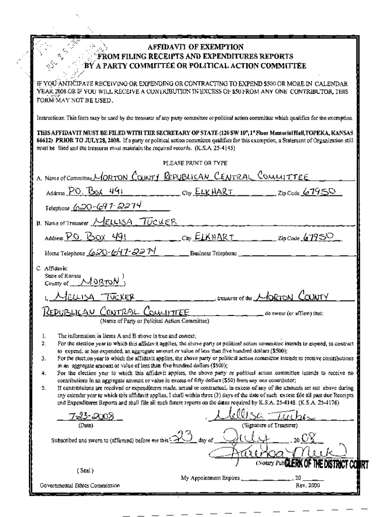 /, \”\'S0AFFIDAVIT OF EXEMPTION r:, ;\'\', FROM FILING RECEIPTS AND EXPENDITURES REPORTS, 3\'\”, B/A PARTY COMMITTEE OR POLITICAL ACTION COMMITTEE.)\”.:;:./.\'\'If yo:/Anticipate RECEDING OR