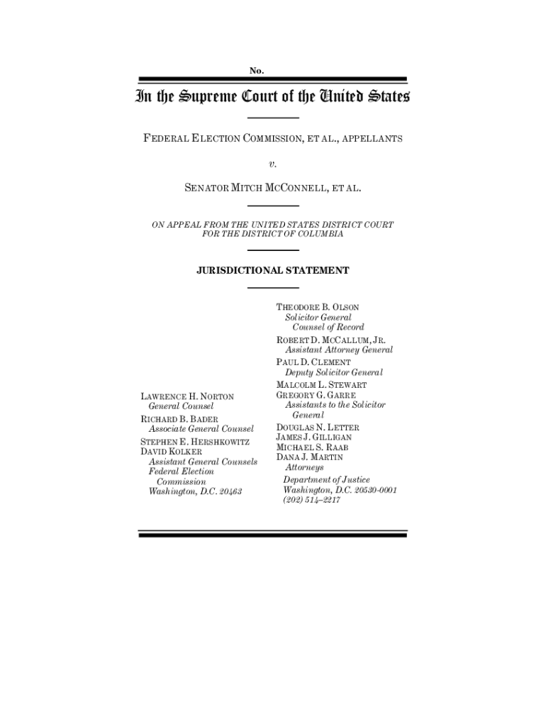 No. In the Supreme Court of the United States FEDERAL ELECTION COMMISSION, ET AL., APPELLANTS v. SENATOR MITCH MCCONNELL, ET AL. ON APPEAL FROM THE UNITED STATES DISTRICT COURT FOR THE DISTRICT OF