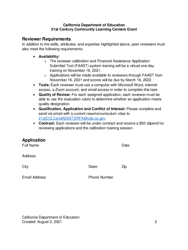California Department of Education 21st Century Community Learning Centers Grant Competition ReviewerQualifications, Application, and Conflict of Interest Reviewer Qualifications At minimum, reviewers