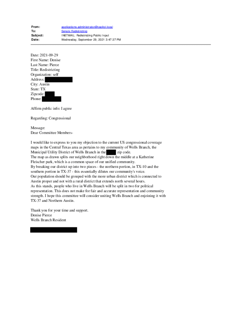 From: To: Subject: Date:applications.administrator×capitol.local Senate Redistricting INITIAL: Redistricting Public Input Wednesday, September 29, 2021 3:47:37 Date: 20210929 First Name: Denise Last