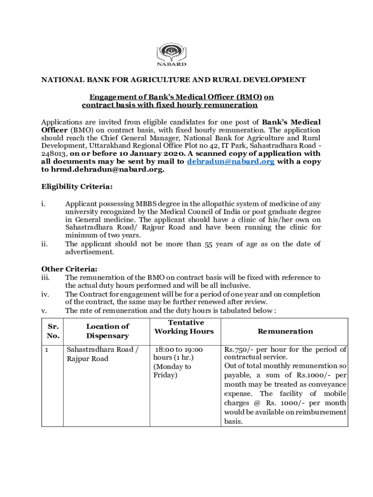 NATIONAL BANK FOR AGRICULTURE AND RURAL DEVELOPMENT Engagement of Banks Medical Officer (BMO) on contract basis with fixed hourly remuneration Applications are invited from eligible candidates for