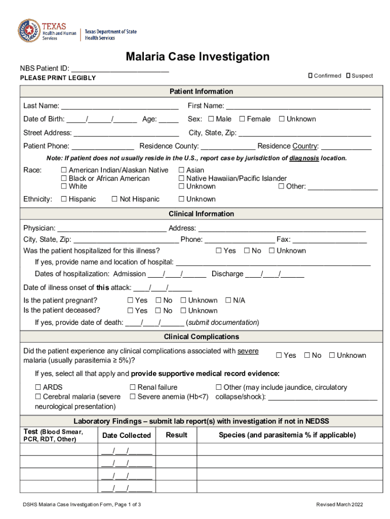 Health and Human Services Texas Department of State Health ServicesMalaria Case Investigation NBS Patient ID: ___ConfirmedPLEASE PRINT LEGIBLYSuspectPatient Information Last Name: ___First Name: ___Date