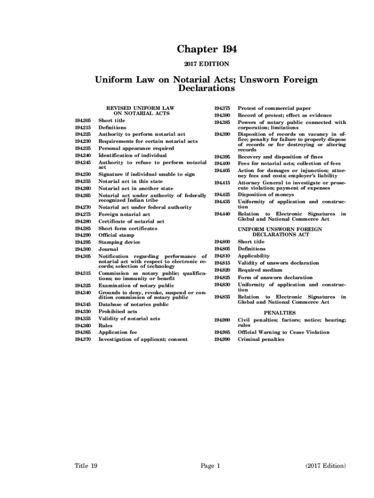 Chapter 194 2017 EDITIONUniform Law on Notarial Acts; Unworn Foreign Declarations194.205 194.215 194.225 194.230 194.235 194.240 194.245 194.250 194.255 194.260 194.265 194.270 194.275 194.280 194.285