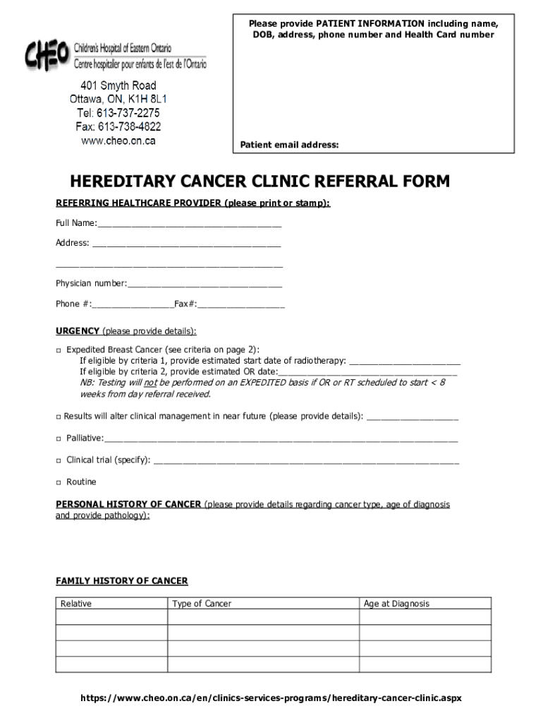 Please provide PATIENT INFORMATION including name, DOB, address, phone number and Health Card numberPatient email address:HEREDITARY CANCER CLINIC REFERRAL FORM REFERRING HEALTHCARE PROVIDER (please