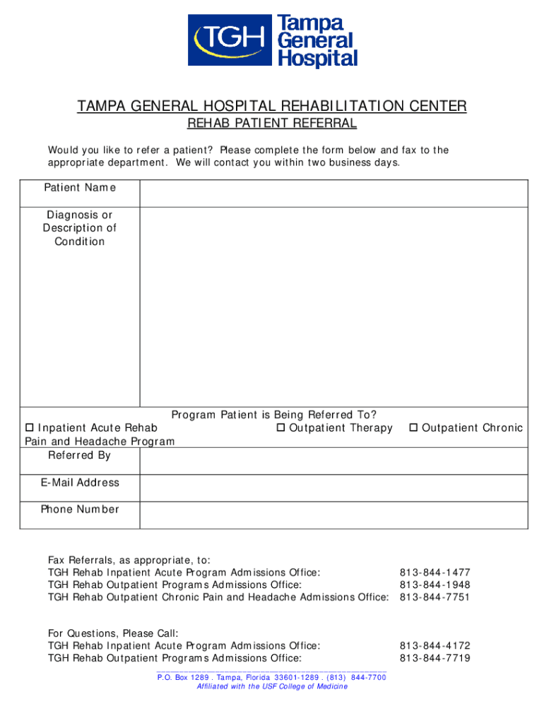 TAMPA GENERAL HOSPITAL REHABILITATION CENTER REHAB PATIENT REFERRALWould you like to refer a patient? Please complete the form below and fax to the appropriate department. We will contact you within