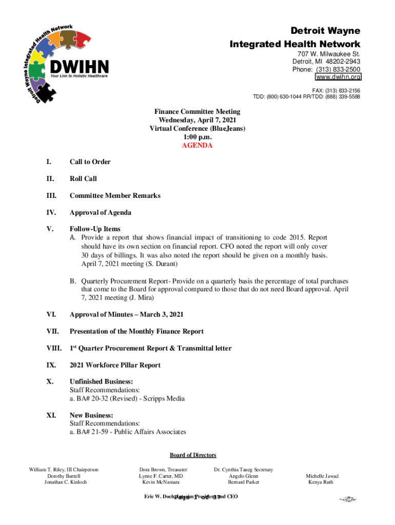 Detroit Wayne Integrated Health Network 707 W. Milwaukee St. Detroit, MI 482022943 Phone: (313) 8332500 www.dwihn.org FAX: (313) 8332156 TDD: (800) 6301044 RR/TDD: (888) 3395588Finance Committee Meeting