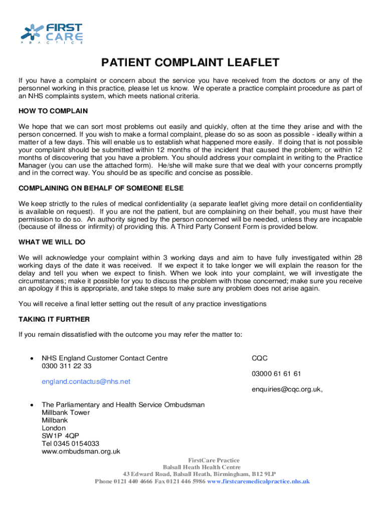 PATIENT COMPLAINT LEAFLET If you have a complaint or concern about the service you have received from the doctors or any of the personnel working in this practice, please let us know. We operate a