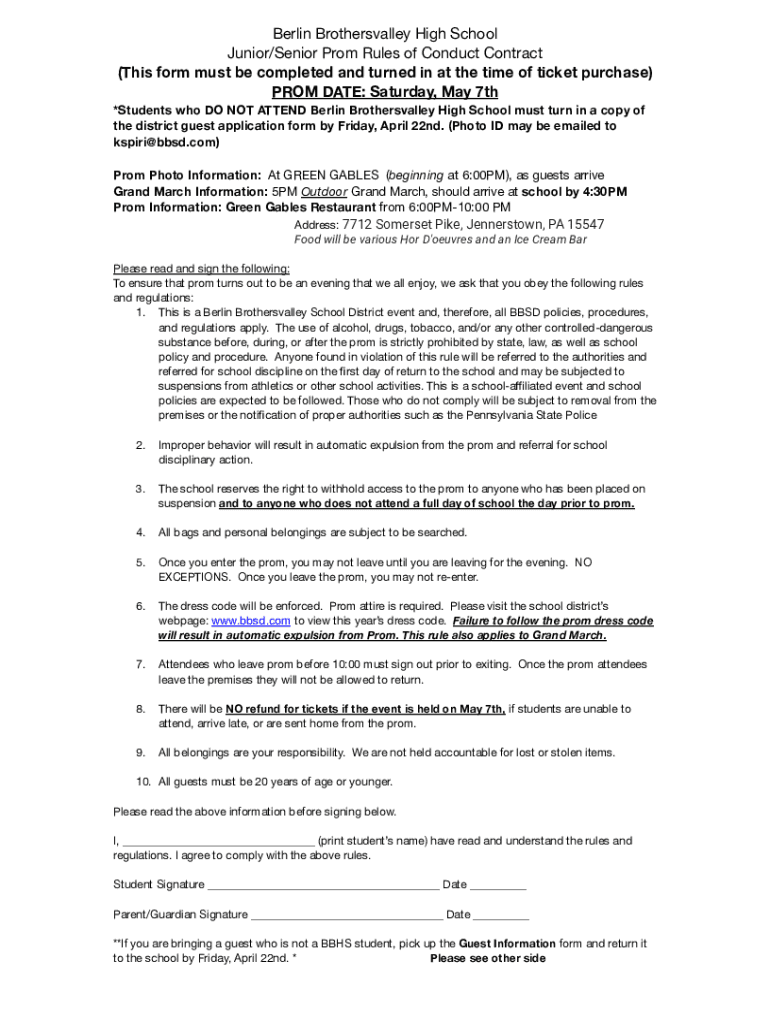 Berlin Brothers valley High School Junior/Senior Prom Rules of Conduct Contract (This form must be completed and turned in at the time of ticket purchase) PROM DATE: Saturday, May 7th *Students who