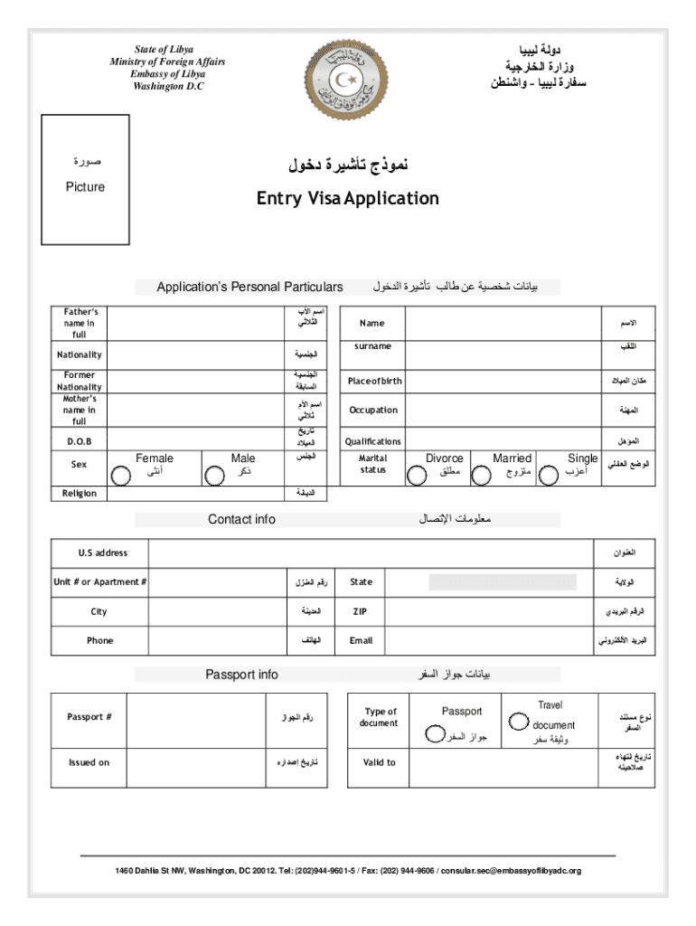 State of Libya Ministry of Foreign Affairs Embassy of Libya Washington D. C PictureEntry Visa ApplicationApplications Personal Particulars Fathers name in full NationalityFormer Nationality Mothers