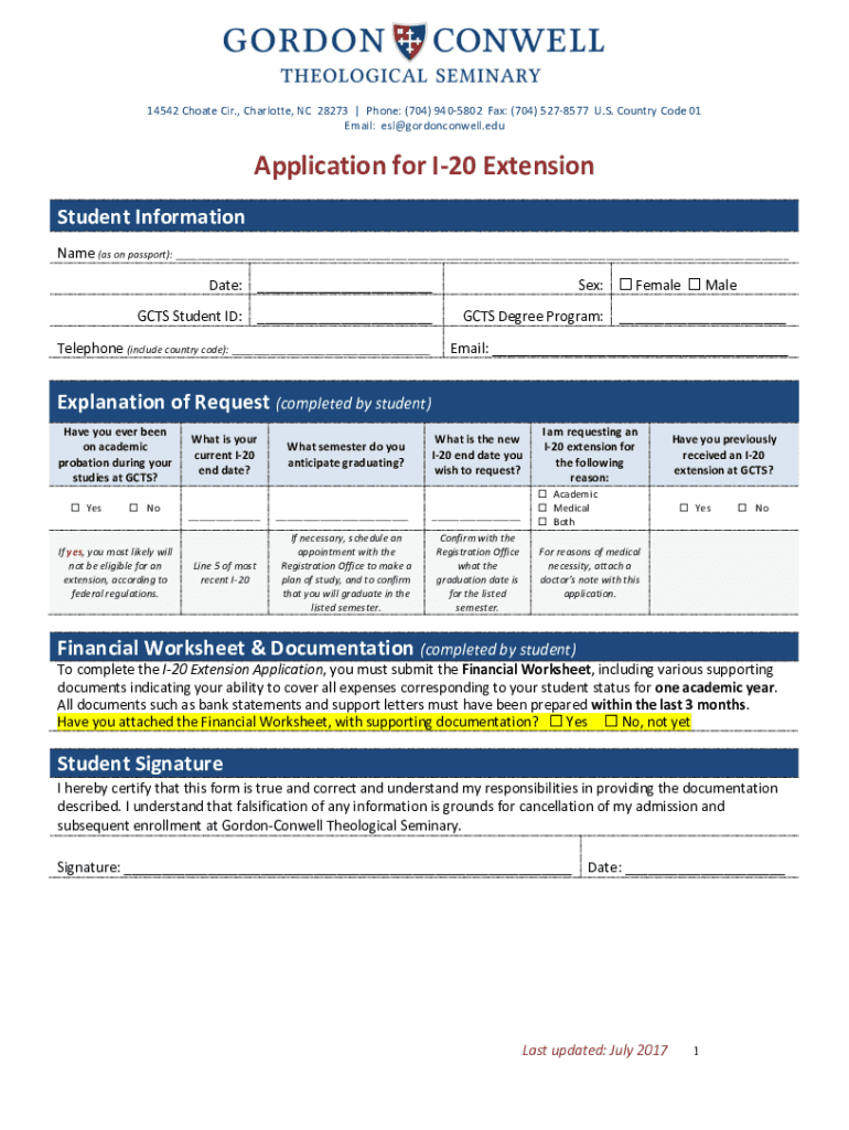 14542 Create Cir., Charlotte, NC 28273 | Phone: (704) 9405802 Fax: (704) 5278577 U.S. Country Code 01 Email: ESL×gordonconwell.application for I20 Extension Student Information Name (as on passport):