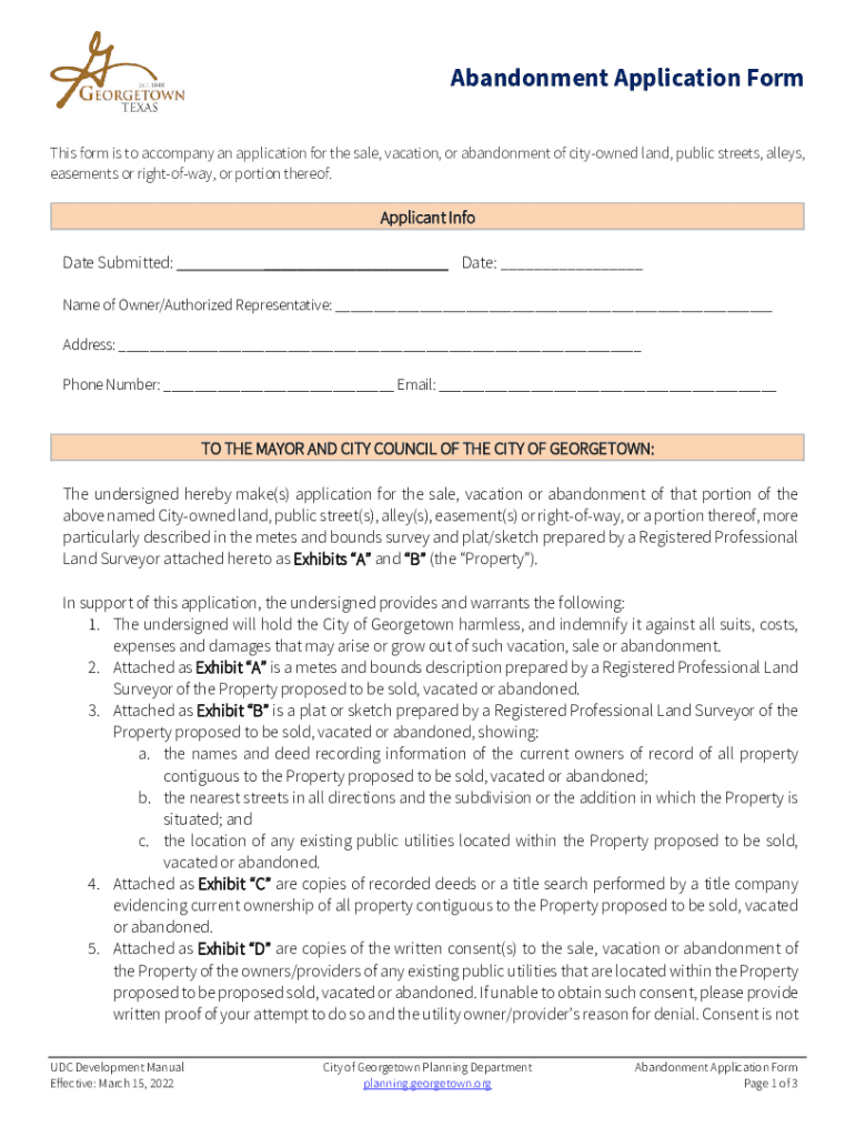 Abandonment Application Form This form is to accompany an application for the sale, vacation, or abandonment of city owned land, public streets, alleys, easements or rightofway, or portion thereof.