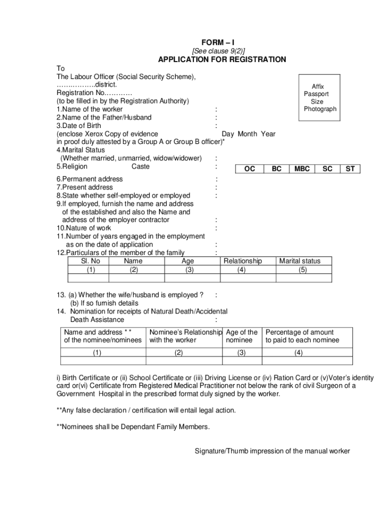 FORM I [See clause 9(2)]APPLICATION FOR REGISTRATION To The Labor Officer (Social Security Scheme), .district. Affix Registration No Passport (to be filled in by the Registration Authority) Size Photograph