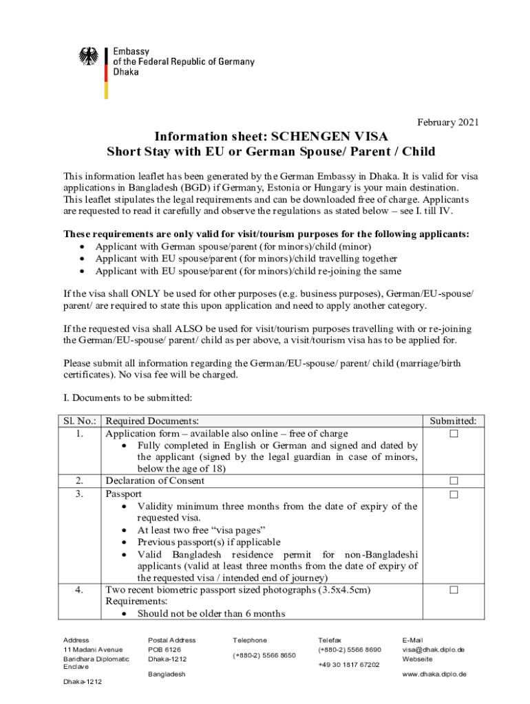 February 2021Information sheet: SCHENGEN VISA Short Stay with EU or German Spouse/ Parent / Child This information leaflet has been generated by the German Embassy in Dhaka. It is valid for visa applications