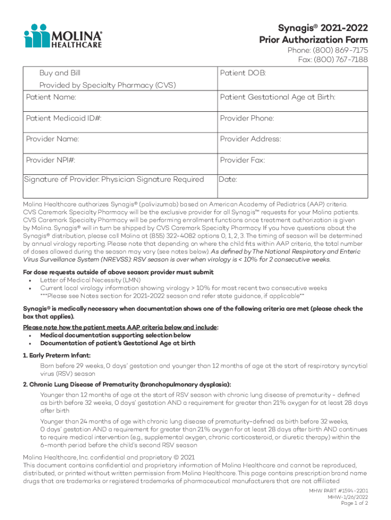 20212022 Prior Authorization Form Phone: (800) 8697175 Fax: (800) 7677188Buy and Impatient DOB:Provided by Specialty Pharmacy (CVS) Patient Name:Patient Gestational Age at Birth:Patient Medicaid ID#:Provider