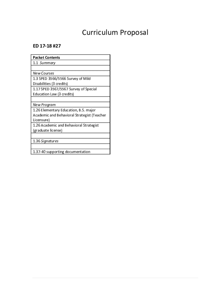 Curriculum Proposal ED 1718 ×27 Packet Contents 1.1 Summary New Courses 1.3 SPED 3566/5566 Survey of Mild Disabilities (3 credits) 1.17 SPED 3567/5567 Survey of Special Education Law (3 credits)