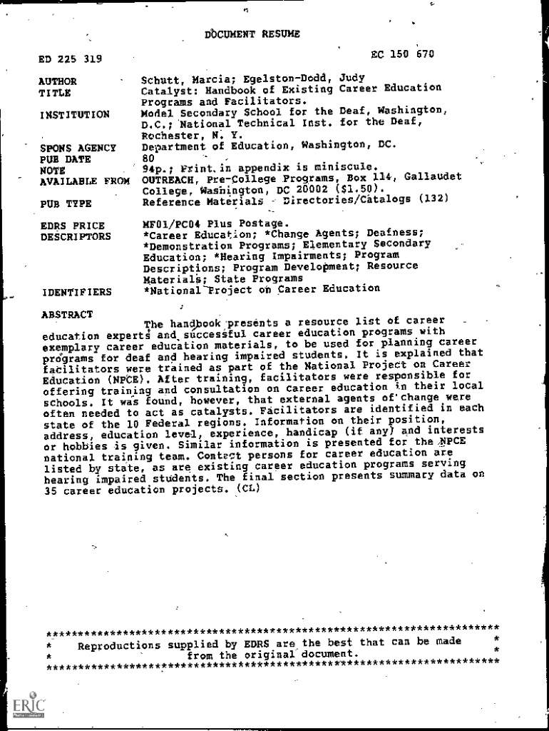 Document RESUME EC 150 670ED 225 319AUTHOR TITLE INSTITUTIONSPONS AGENCY PUB DATE NOTE AVAILABLE FROM TYPE EARS PRICE DESCRIPTORSIDENTIFIERSSchutt, Marcia; EgelstonDodd, Judy Catalyst: Handbook of