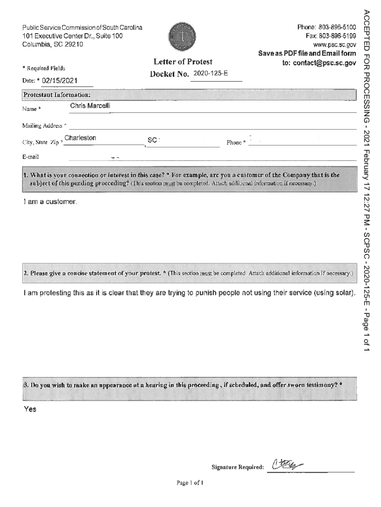 Columbia, SC 29210 *Letter of ProtestRequired Fieldsman:*Save as PDF file and Email form to: contact×PSC.SC.docket No. 202002/15/2021125Protestant Information: Name Chris Marcella×Mailing Address