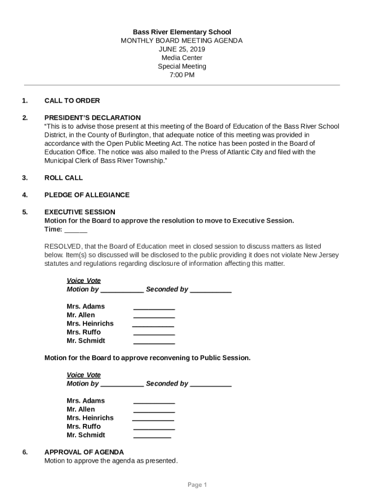 Bass River Elementary School MONTHLY BOARD MEETING AGENDA JUNE 25, 2019, Media Center Special Meeting 7:00 PM1.CALL TO ORDER2.PRESIDENTS DECLARATION This is to advise those present at this meeting