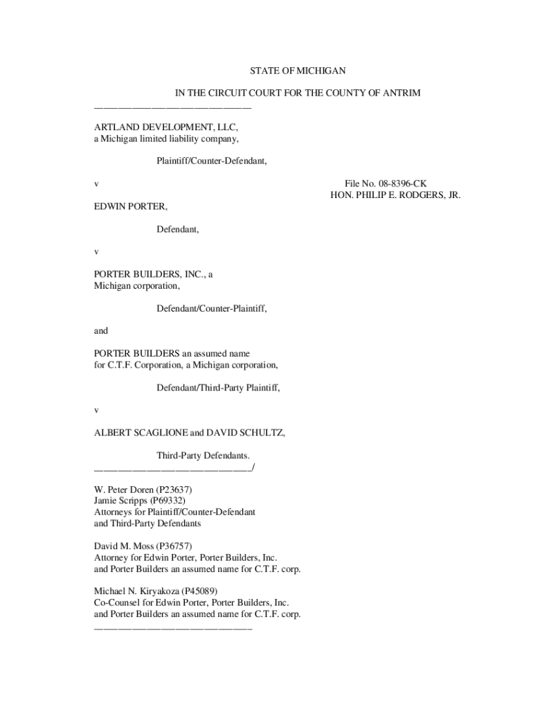 STATE OF MICHIGAN IN THE CIRCUIT COURT FOR THE COUNTY OF ANTRUM ___ HARTLAND DEVELOPMENT, LLC, a Michigan limited liability company, Plaintiff/CounterDefendant, file No. 088396CK HON. PHILIP E. RODGERS,