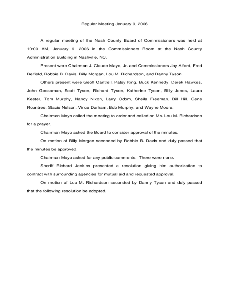 Regular Meeting January 9, 2006A regular meeting of the Nash County Board of Commissioners was held at 10:00 AM, January 9, 2006, in the Commissioners Room at the Nash County Administration Building