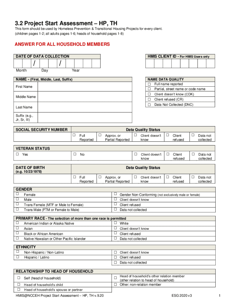 3.2 Project Start Assessment HP, TH This form should be used by Homeless Prevention & Transitional Housing Projects for every client. (children pages 12; all adults pages 16; heads of household pages