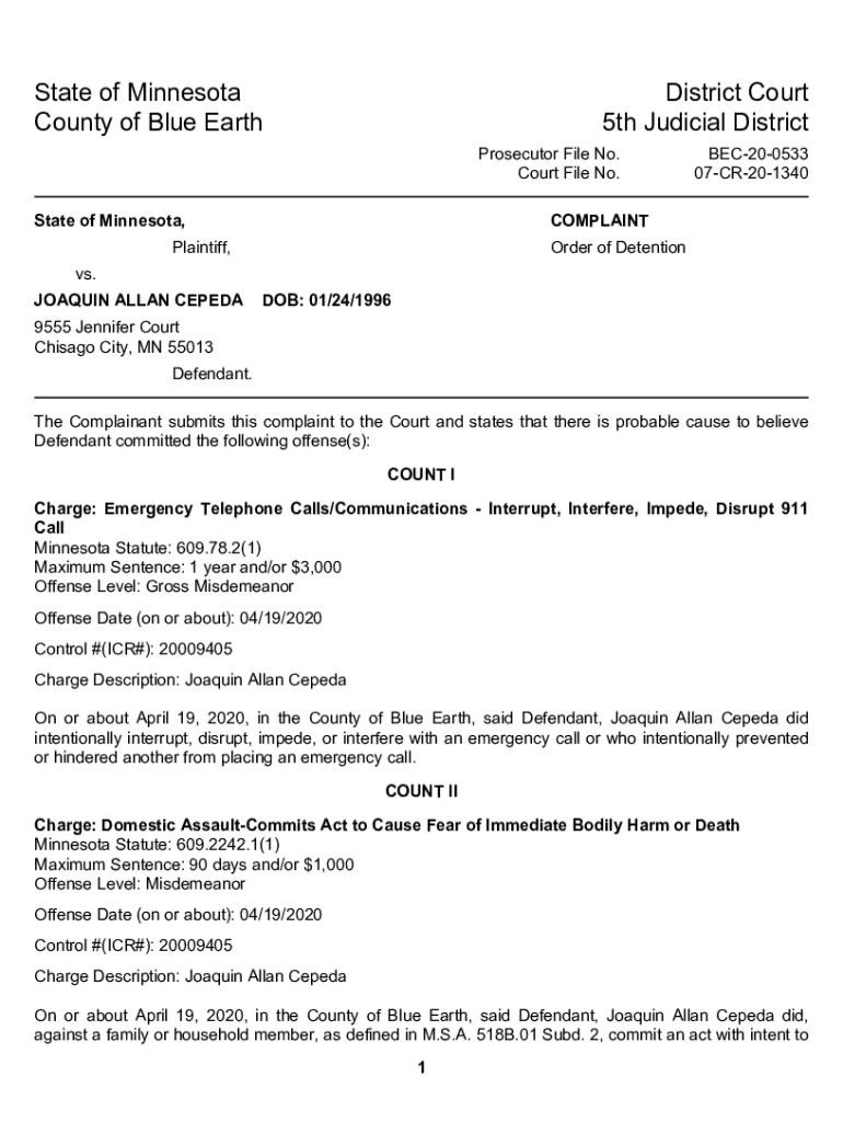 StateofMinnesota CountyofBlueEarthDistrictCourt 5thJudicialDistrict ProsecutorFileNo. CourtFileNo. StateofMinnesota,BEC200533 07CR201340COMPLAINTPlaintiff,OrderofDetentionvs. JOAQUINALLANCEPEDADOB:01/24/1996