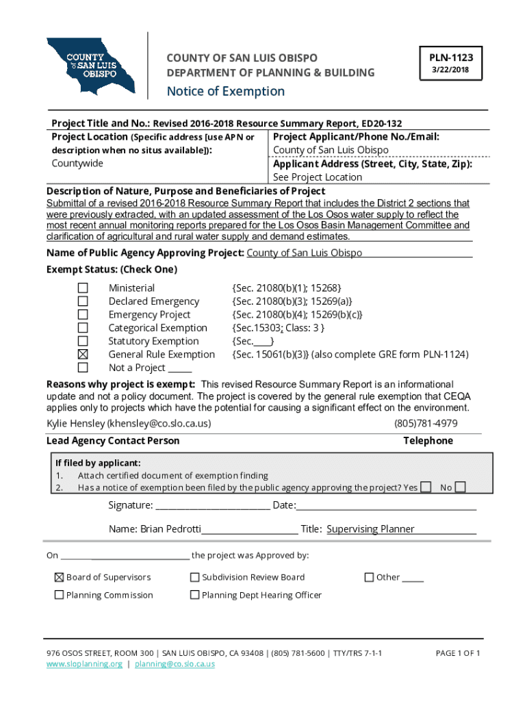 Get the free Notice of Exemption - San Luis Obispo