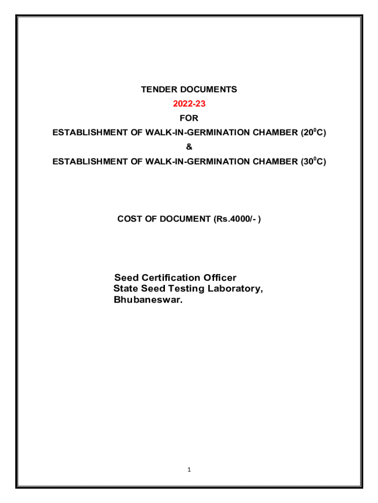 TENDER DOCUMENTS 202223 FOR ESTABLISHMENT OF WALKINGERMINATION CHAMBER (200C) & ESTABLISHMENT OF WALKINGERMINATION CHAMBER (300C)COST OF DOCUMENT (Rs.4000/)Seed Certification Officer State Seed Testing