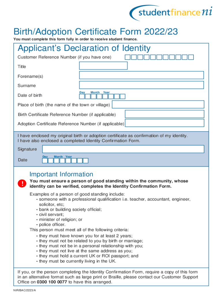 Birth/Adoption Certificate Form 2022/23 You must complete this form fully in order to receive student finance. Applicants Declaration of Identity Customer Reference Number (if you have one) Title