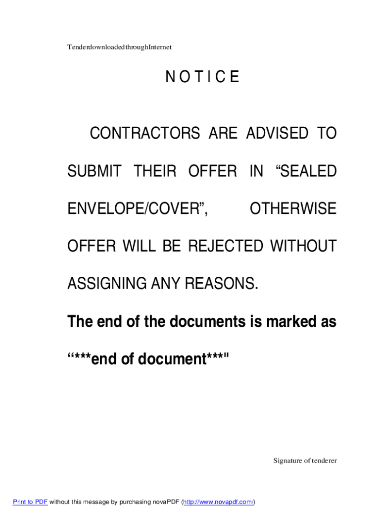 TenderdownloadedthroughInternetNOTICE CONTRACTORS ARE ADVISED TO SUBMIT THEIR OFFER IN SEALED ENVELOPE/COVER, OTHERWISEOFFER WILL BE REJECTED WITHOUT ASSIGNING ANY REASONS. The end of the documents