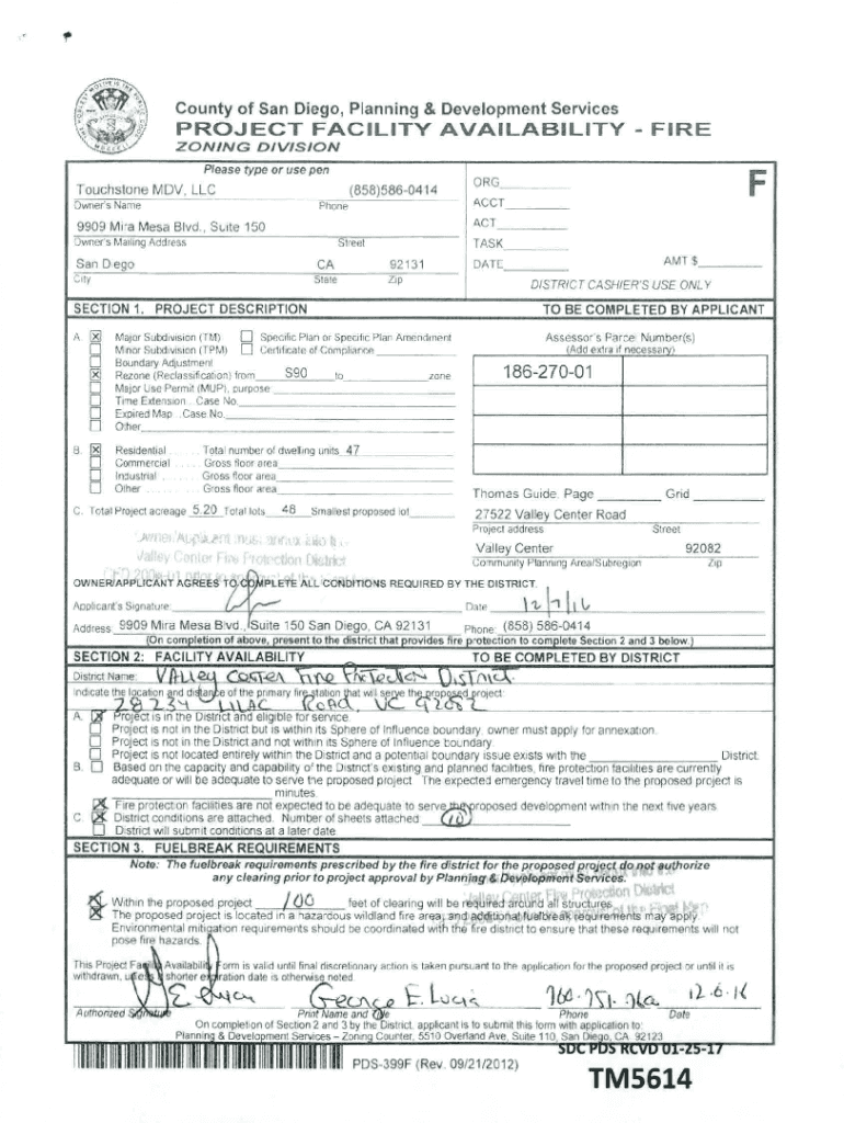 County of San Diego, Planning & Development Services P R O J E C T FACILITY AVAILABILITY ZONINGFIREDIVISIONPlease type or use pen Touchstone MDV. LLC(858)5860414Owner\'s Name ACCTPhoneACT×9909 Mira
