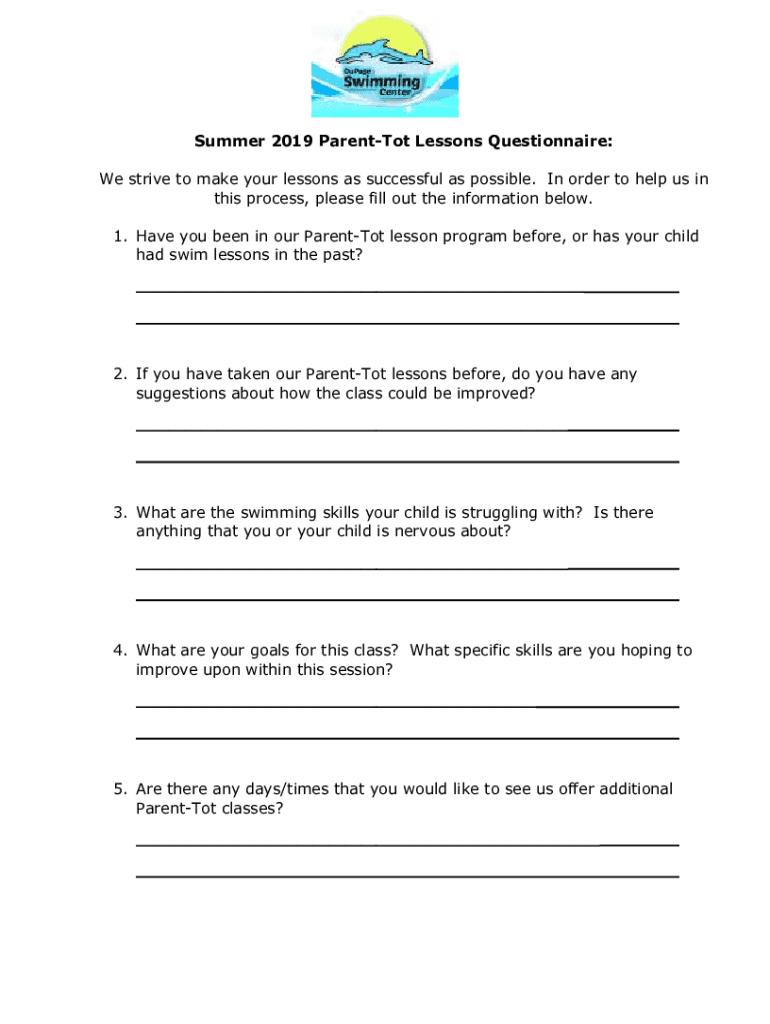 Summer 2019 Parents Lessons Questionnaire: We strive to make your lessons as successful as possible. In order to help us in this process, please fill out the information below. 1. Have you been in