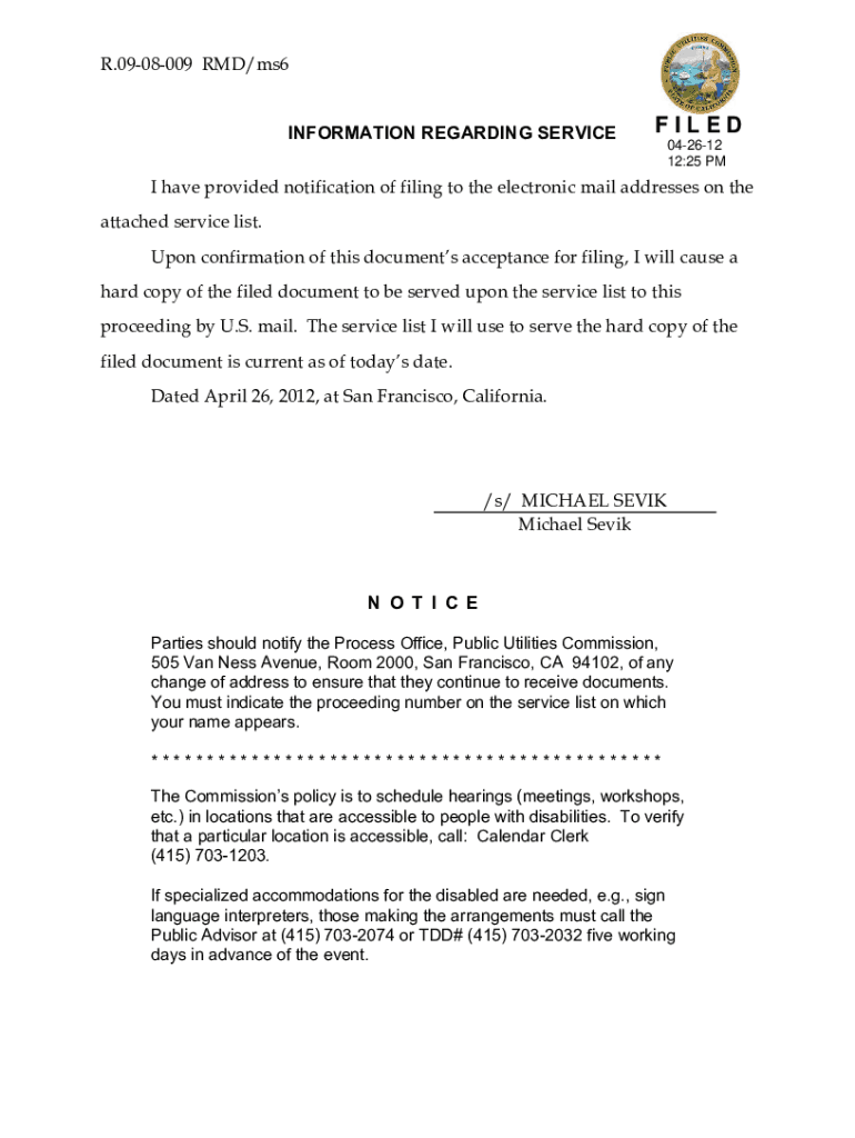 R.0908009 RED/ms6INFORMATION REGARDING SERVICEABLE 042612 12:25 PMI have provided notification of filing to the electronic mail addresses on the attached service list. Upon confirmation of these documents'