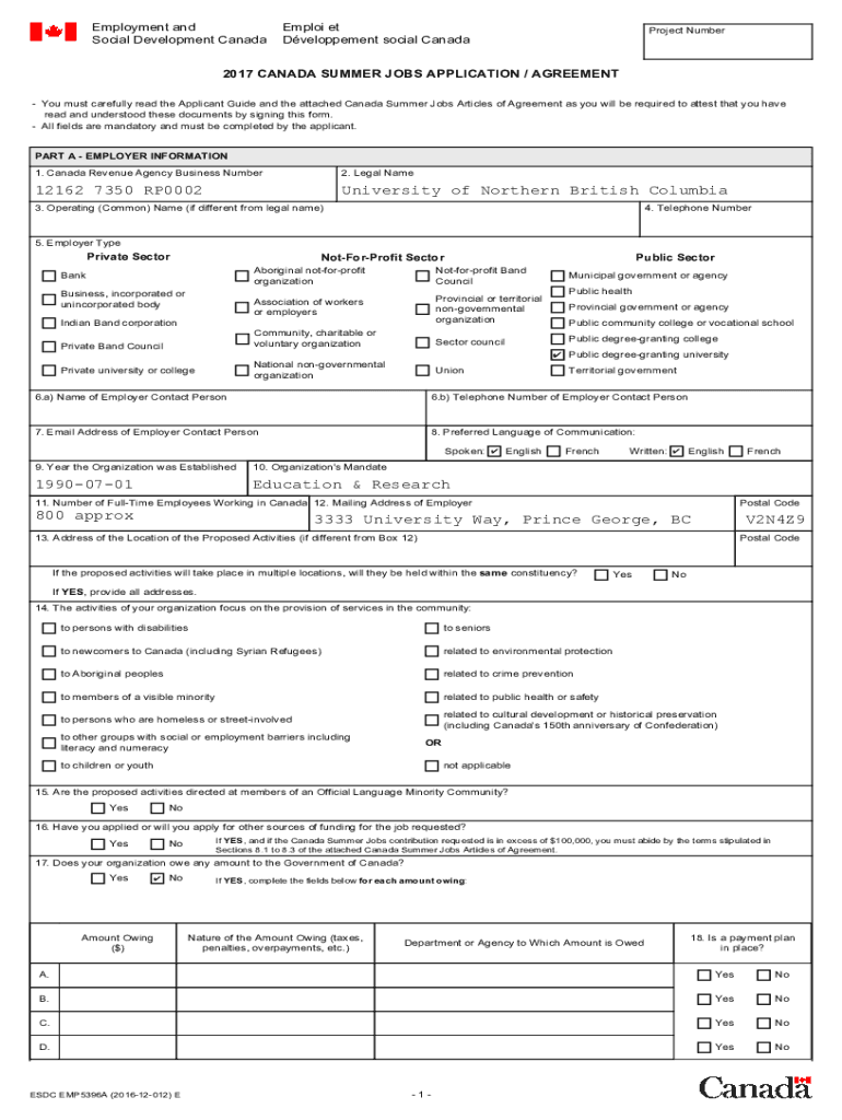 Get the free 2016 CANADA SUMMER JOBS APPLICATION / AGREEMENT. EMP5396AE