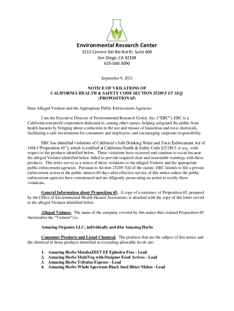 Environmental Research Center 3111 Camino Del Rio North, Suite 400 San Diego, CA 92108 6195003090 September 9, 2021, NOTICE OF VIOLATIONS OF CALIFORNIA HEALTH & SAFETY CODE SECTION 25249.5 ET SEQ.