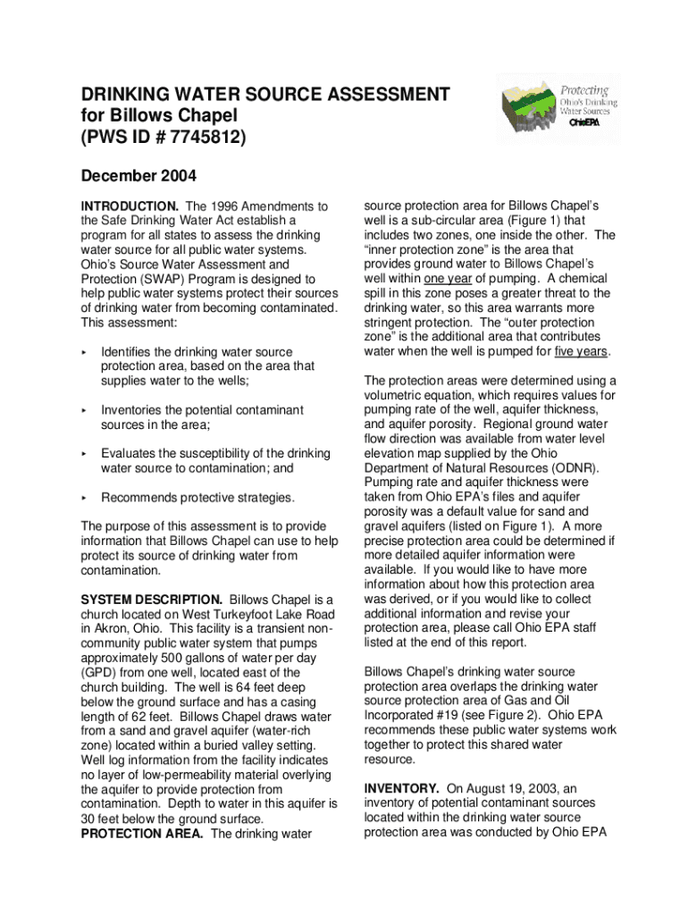 DRINKING WATER SOURCE ASSESSMENT for Billows Chapel (PCs ID # 7745812) December 2004 INTRODUCTION. The 1996 Amendments to the Safe Drinking Water Act establish a program for all states to assess the