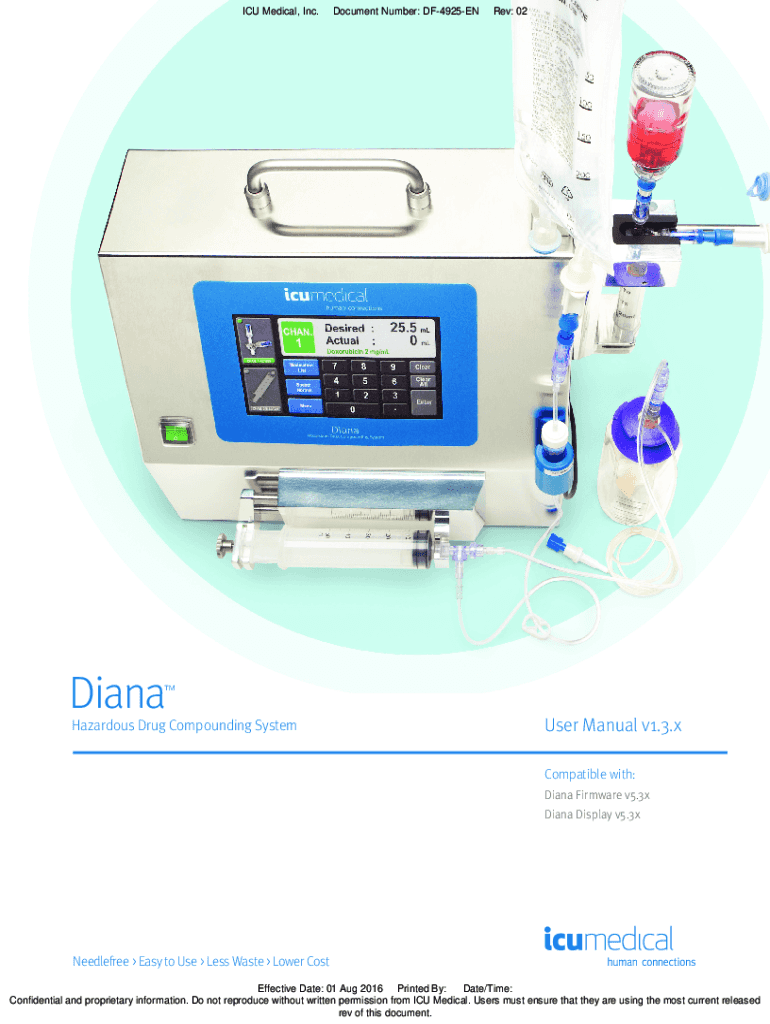 Document Number: DF4925ENRev: 02DianaEffectiveICU Medical, Inc. Hazardous Drug Compounding Systems Manual v1.3.x Compatible with: Diana Firmware v5.3x Diana Display v5.3xNeedlefree Easy to Use Less