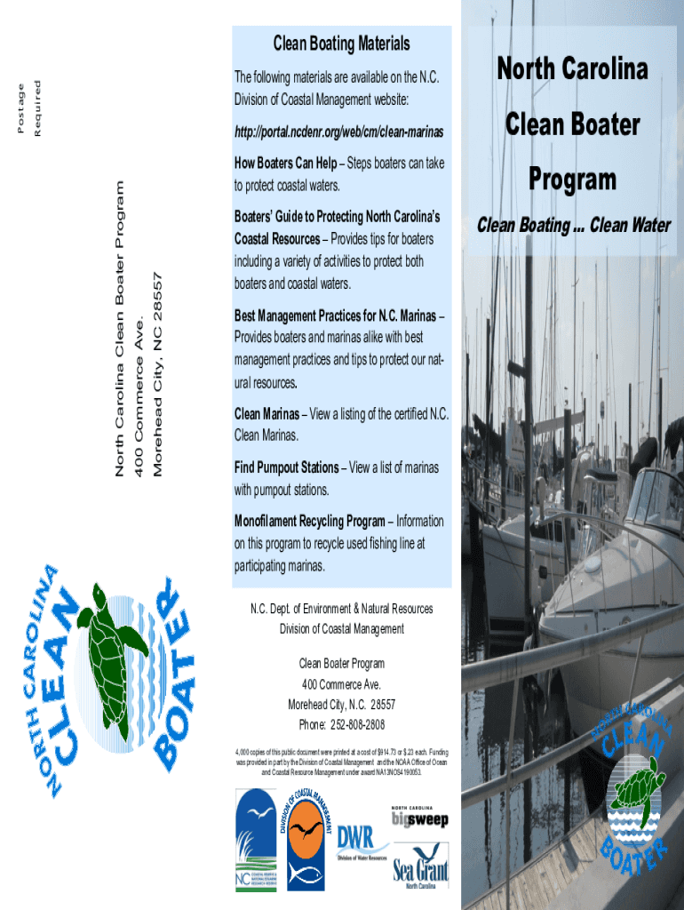 North CarolinaRequiredThe following materials are available on the N.C. Division of Coastal Management website:Clean Boater ProgramBoaters Guide to Protecting North Carolina's Coastal Resources Provides