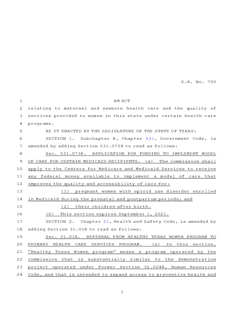 S.B.ANO. A7501AN ACT2relating to maternal and newborn health care and the quality of3services provided to women in this state under certain health care4programs.5BE IT ENACTED BY THE LEGISLATURE OF