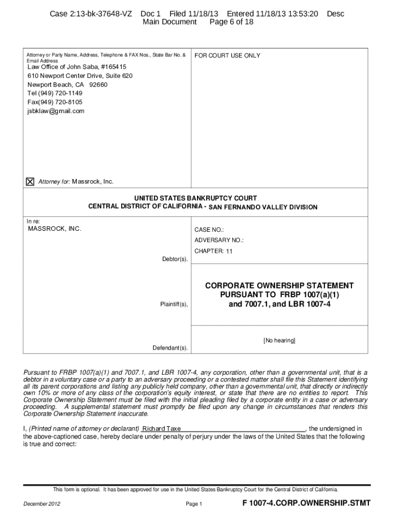 Case 2:13bk37648VZDoc 1 Filed 11/18/13 Entered 11/18/13 13:53:20 Main Document Page 1 of 18DescB1 (Official Form 1) (04/13) UNITED STATES BANKRUPTCY COURT VOLUNTARY PETITION Central District ofofCalifornia
