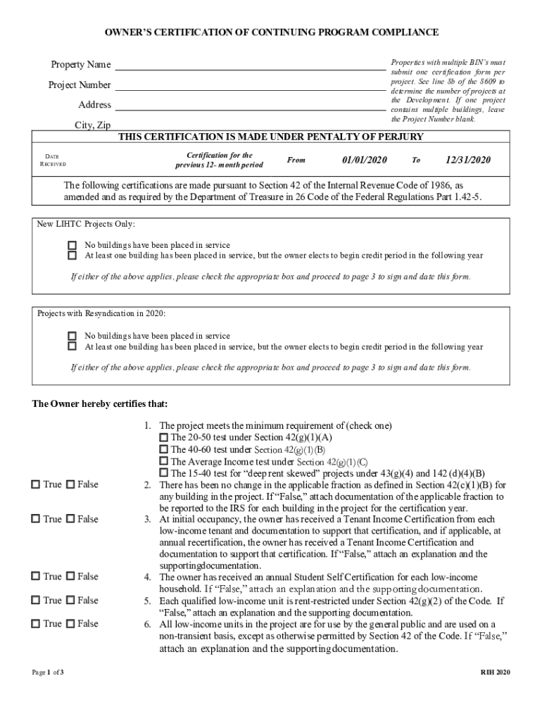 OWNERS CERTIFICATION OF CONTINUING PROGRAM COMPLIANCE Properties with multiple BIN's must submit one certification form per project. See line 8b of the 8609 to determine the number of projects at