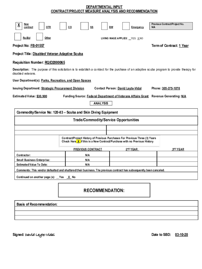 DEPARTMENTAL INPUT CONTRACT/PROJECT MEASURE ANALYSIS AND RECOMMENDATIONXNew contractReBidOTRCOSSOtherBWEmergencyLIVING WAGE APPLIES:Previous Contract/Project No. N/AYES X Project No: FB01557Term of