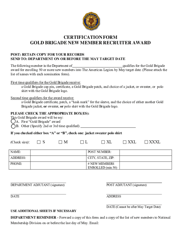 Get the free www.legion.orgpdfmembershipgoldbrigadeCERTIFICATION FORM GOLD BRIGADE NEW MEMBER REC...