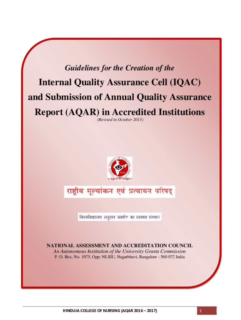 Guidelines for the Creation of internal Quality Assurance Cell (IAC) and Submission of Annual Quality Assurance Report (AGAR) in Accredited Institutions (Revised in October 2013)NATIONAL ASSESSMENT