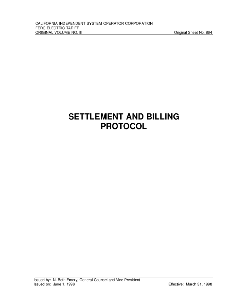 CALIFORNIA INDEPENDENT SYSTEM OPERATOR CORPORATION FERC ELECTRIC TARIFF ORIGINAL VOLUME NO. Original Sheet No. 864SETTLEMENT AND BILLING Protocolized by: N. Beth Emery, General Counsel and Vice President