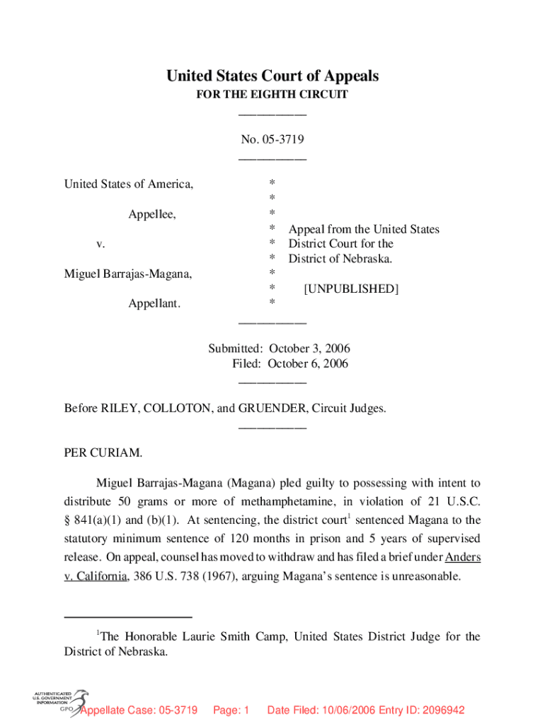 United States Court of Appeals FOR THE EIGHTH CIRCUIT___ No. 053719 ___ United States of America, Appealed, v. Miguel BarrajasMagana, Appellant.* * * * Appeal from the United States * District Court